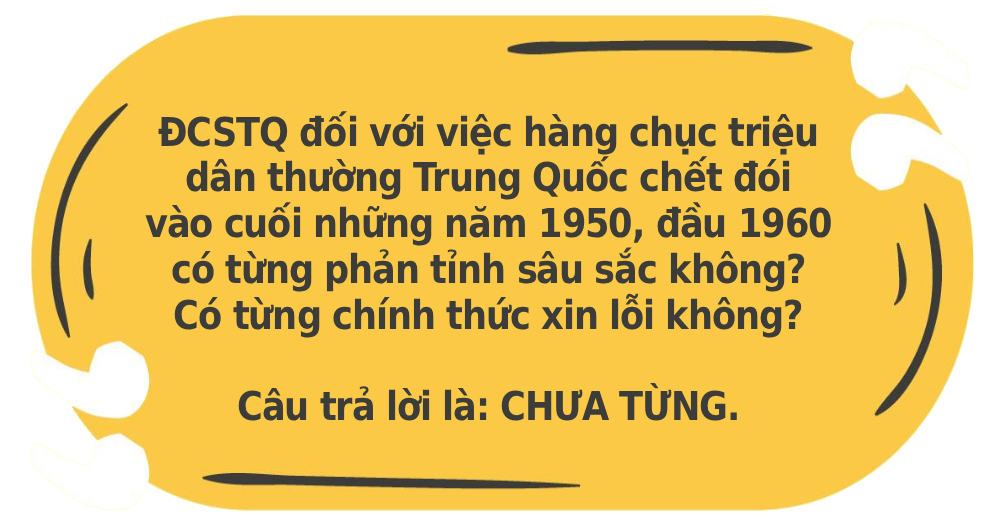 Ví dụ, do các chính sách cực tả của ĐCSTQ, nạn đói lớn cuối thập niên 1950 – đầu 1960 đã khiến hàng chục triệu người chết đói.