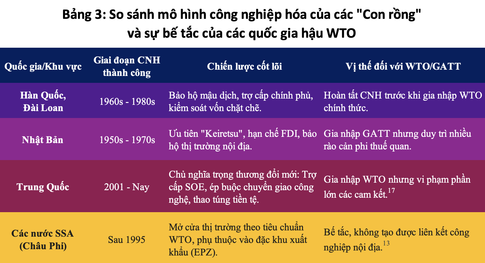 Một trong những lập luận mạnh mẽ nhất chống lại tính hiệu quả của chủ nghĩa toàn cầu hóa hiện đại (kỷ nguyên WTO) là sự bế tắc của quá trình công nghiệp hóa tại hầu hết các quốc gia đang phát triển. Lịch sử kinh tế cho thấy, tất cả các cường quốc công nghiệp hiện nay – bao gồm cả các “con rồng” Châu Á như Nhật Bản, Hàn Quốc, Đài Loan và Singapore – đều hoàn thành quá trình công nghiệp hóa trước khi tham gia sâu vào các cam kết thương mại tự do của WTO.