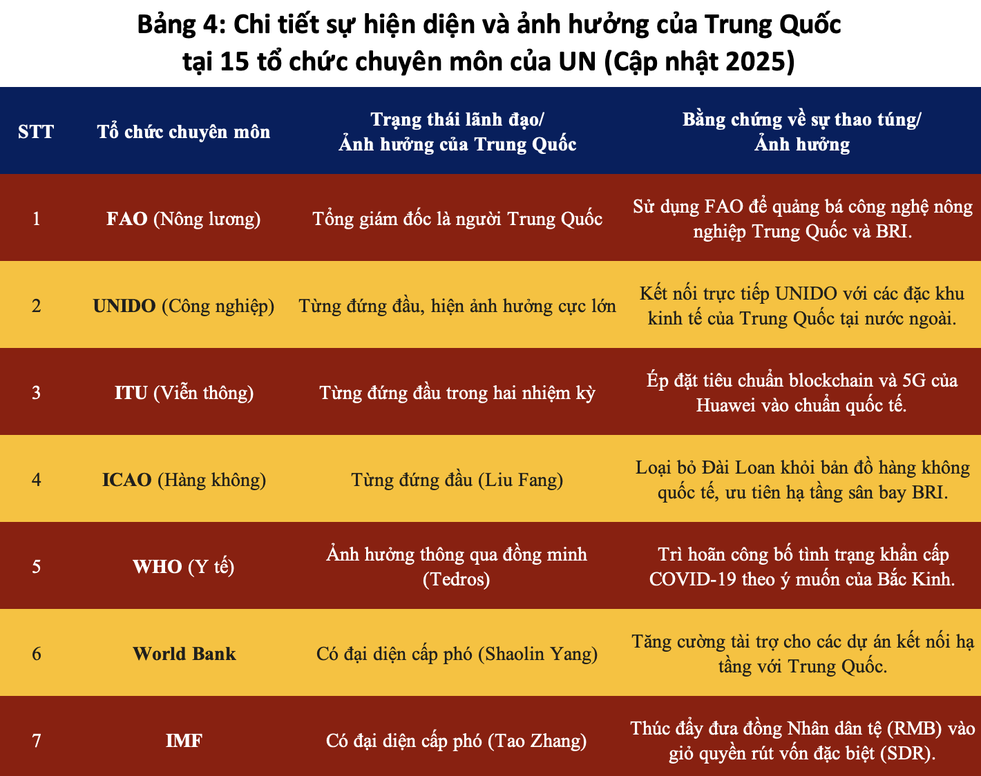 Tính đến giai đoạn 2024-2025, các bằng chứng cho thấy Trung Quốc đã thành công trong việc kiểm soát hoặc gây ảnh hưởng chi phối tại 9 trên 15 tổ chức chuyên môn chính của Liên Hợp Quốc (UN). Điều này được thực hiện thông qua việc đặt người của mình vào các vị trí lãnh đạo cao nhất hoặc nắm giữ các chức vụ cấp phó then chốt để điều phối chương trình nghị sự (9).