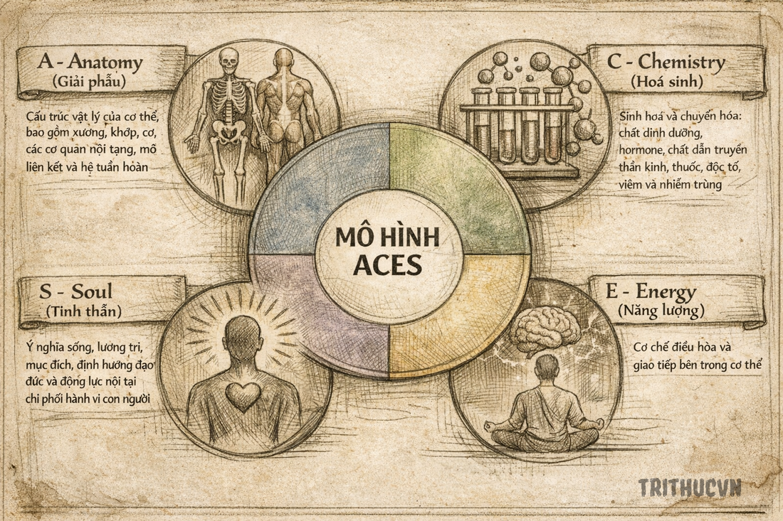 Để hiểu vì sao sức khỏe tinh thần lại có ý nghĩa sâu sắc đến vậy, cần nhìn lại cách chúng ta định nghĩa về sức khỏe. Qua hơn 30 năm thực hành lâm sàng, tôi nhận thấy rằng gần như mọi vấn đề sức khỏe đều có thể được lý giải thông qua 4 phương diện liên kết chặt chẽ với nhau. Cách tiếp cận này được tóm tắt trong Mô hình Sức khỏe ACES, trong đó ACES là viết tắt của Anatomy (Giải phẫu), Chemistry (Hóa sinh), Energy (Năng lượng) và Soul (Tinh thần).