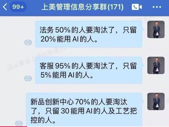 Hình ảnh cho thấy ông Lã Nghĩa Hùng, người sáng lập Công ty TNHH Shanghai Jahwa, đã đề cập đến việc “dùng AI thay thế con người” trong một nhóm làm việc có 171 thành viên. Ví dụ: bộ phận pháp chế sẽ đào thải 50%, chỉ giữ lại 20% những người biết sử dụng AI; bộ phận chăm sóc khách hàng đào thải 95%, chỉ giữ lại 5% người biết dùng AI; trung tâm sáng tạo sản phẩm mới đào thải 70%, chỉ giữ lại 30% người biết dùng AI và kiểm soát quy trình; bộ phận sáng tạo nội dung đào thải 80%, chỉ giữ lại 20% người biết dùng AI.