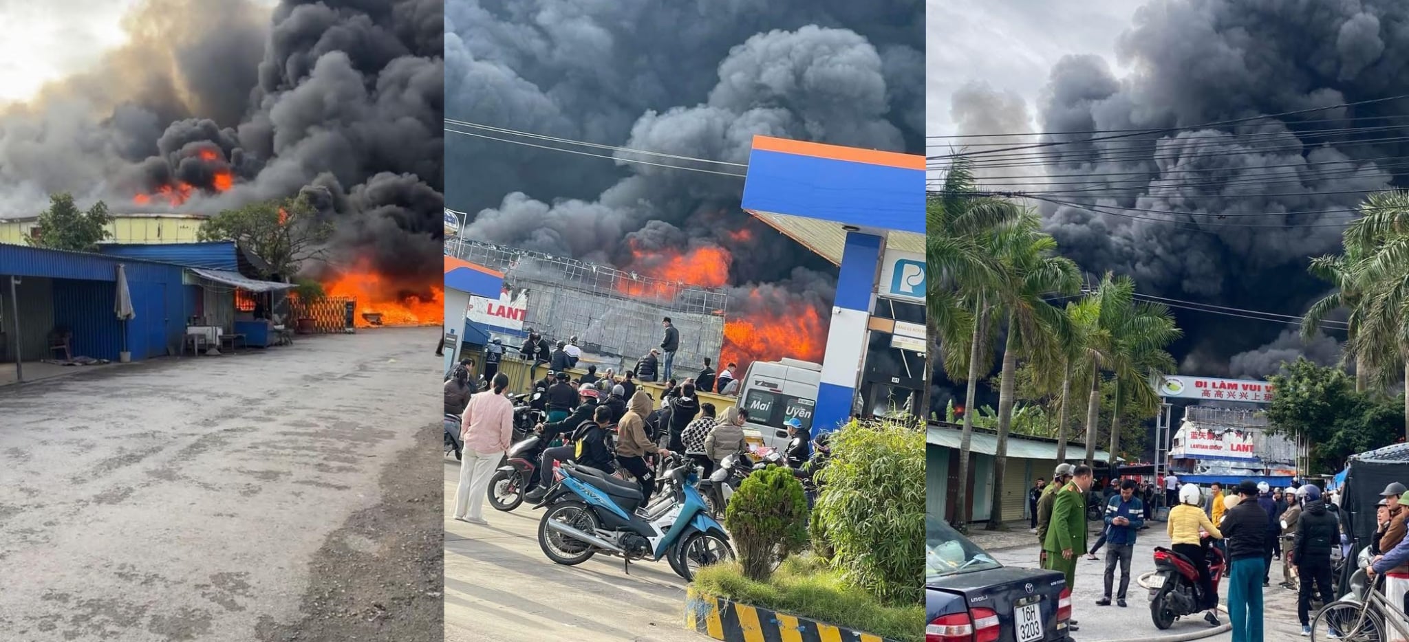 Hình ảnh cho người dân ghi lại cho thấy lửa cháy đỏ rực, lan rộng, các cột khói đen đặc quánh cuồn cuộn bốc cao hàng trăm mét. Một phần mái nhà xưởng đã đổ sập…