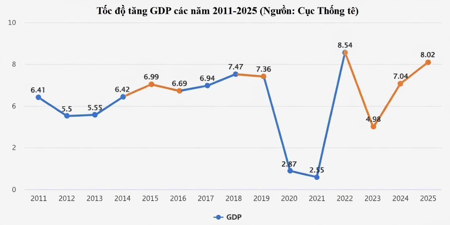 GDP cả năm 2025 ước tăng 8,02% so với năm trước, chỉ thấp hơn mức tăng của năm 2022 trong giai đoạn 2011-2025.
