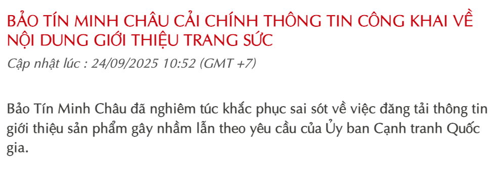 Trên website của Bảo Tín Minh Châu đã đăng tải thông tin cải chính. Theo đó, doanh nghiệp vàng này thừa nhận bài viết giới thiệu về trang sức kiềng bán nguyệt nói “trang sức làm bằng chất liệu vàng Rồng Thăng Long 99.9, 999.9 (24k)” là chưa rõ ràng. Công ty đã gỡ bỏ hình ảnh, thông tin đăng tải nói trên.