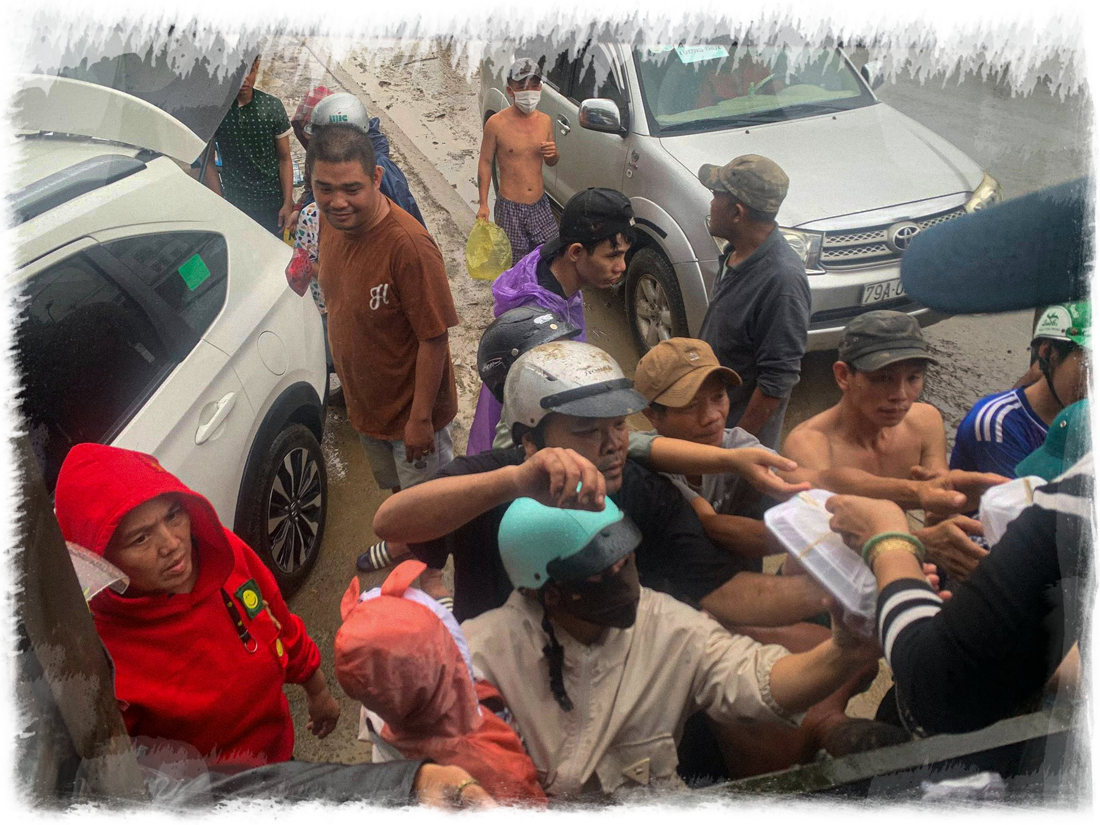 “Họ tội lắm, họ xếp hàng mà chỉ lấy phần cơm vừa đủ cho mình thôi chứ không có lấy dư”, chị Yến nhớ lại, “Khi bà con ra nhận cơm, họ rất đói, họ cảm ơn”. Người này người kia dép không có, áo quần không có, ướt hết, trôi hết cả.