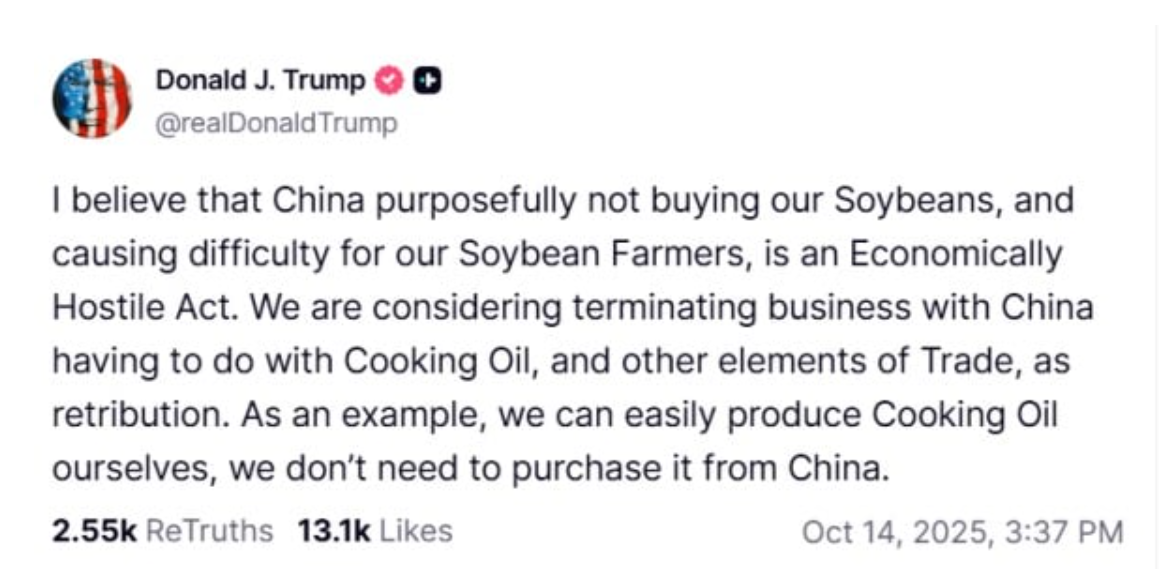 Cuộc chiến thương mại Mỹ – Trung ngày càng trở nên căng thẳng. Vào thứ Ba (14/10), Tổng thống Trump cho biết chính quyền Trung Quốc cố tình không mua đậu nành của Mỹ. Đáp lại hành động thù địch này, Mỹ đang xem xét chấm dứt một số hoạt động thương mại với Trung Quốc, bao gồm cả việc nhập khẩu dầu ăn từ nước này. Ông cũng cảnh báo rằng cần hết sức thận trọng khi giao dịch với chính quyền Trung Quốc.