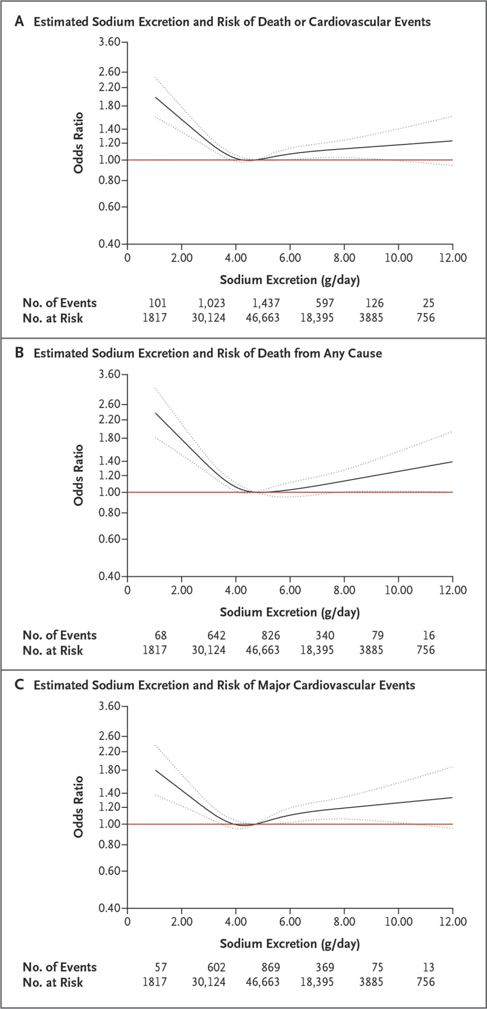 Một nghiên cứu đăng trên The New England Journal of Medicine cũng cho thấy mối liên hệ giữa muối và sức khỏe phức tạp hơn nhiều. Nghiên cứu này theo dõi hơn 100.000 người ở 17 quốc gia trong trung bình 3,7 năm. Các nhà nghiên cứu phát hiện mối liên hệ hình chữ J giữa lượng natri thải qua nước tiểu và nguy cơ tử vong hoặc biến cố tim mạch. Điều này cho thấy cả lượng natri quá cao lẫn quá thấp đều có thể làm tăng rủi ro sức khỏe đối với dân số nói chung.