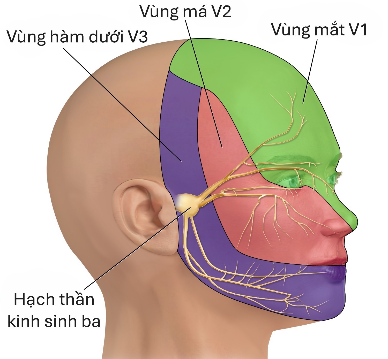 Dây thần kinh này có ba nhánh chính — nhánh mắt (V1), nhánh hàm trên (V2) và nhánh hàm dưới (V3) — trải dài khắp khuôn mặt. Các nhánh này lần lượt cung cấp cảm giác cho trán, mắt, má và hàm tương ứng. Khi bề mặt giác mạc bị khô, nó sẽ kích thích các đầu mút thần kinh và gửi tín hiệu đến thân não. Điều này không chỉ gây cảm giác khó chịu mà còn có thể kích hoạt các đường dẫn truyền đau liên quan đến chứng đau nửa đầu và nhạy cảm với ánh sáng.