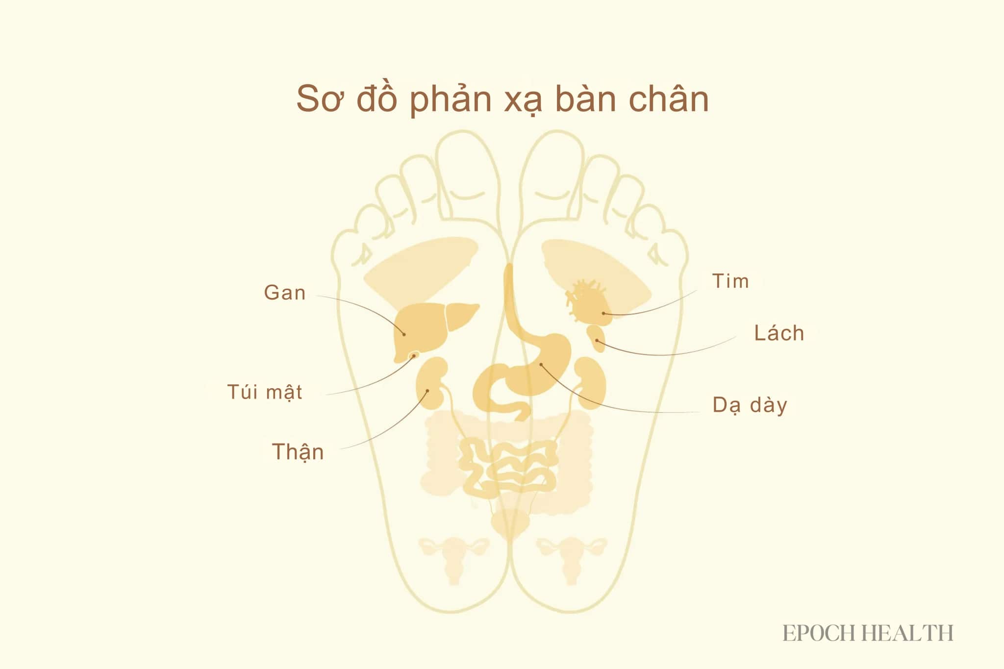 Các cơ quan chính của cơ thể được phản ánh trên các vùng phản xạ ở gan bàn chân: