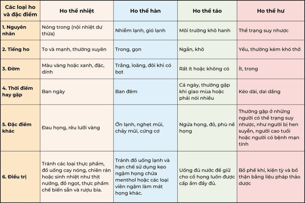 Ho được phân loại dựa trên các đặc điểm như màu sắc và lượng đờm, tiếng ho và thời điểm khởi phát.