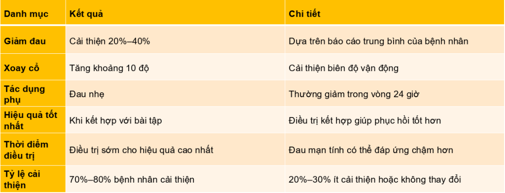 Phần lớn bệnh nhân đạt được cải thiện rõ rệt nhất trong khoảng từ 2 – 6 tuần đầu, với điểm đau giảm ước tính từ 20% – 40%. Một số trường hợp có thể xuất hiện cảm giác đau nhức nhẹ sau điều trị song các biến chứng nghiêm trọng được ghi nhận là hiếm gặp.