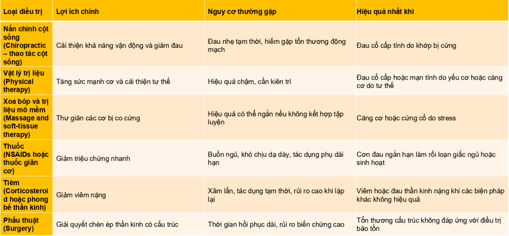 Trong các trường hợp đau kéo dài, việc phối hợp nắn chỉnh với tập luyện và điều chỉnh tư thế mang lại chiến lược cải thiện hiệu quả nhất. Khi được sàng lọc phù hợp và trao đổi thông tin rõ ràng, nhiều người bị đau cổ gần đây có thể cải thiện trong vài tuần đầu và quay trở lại sinh hoạt hằng ngày với mức độ đau và khó chịu giảm đáng kể.