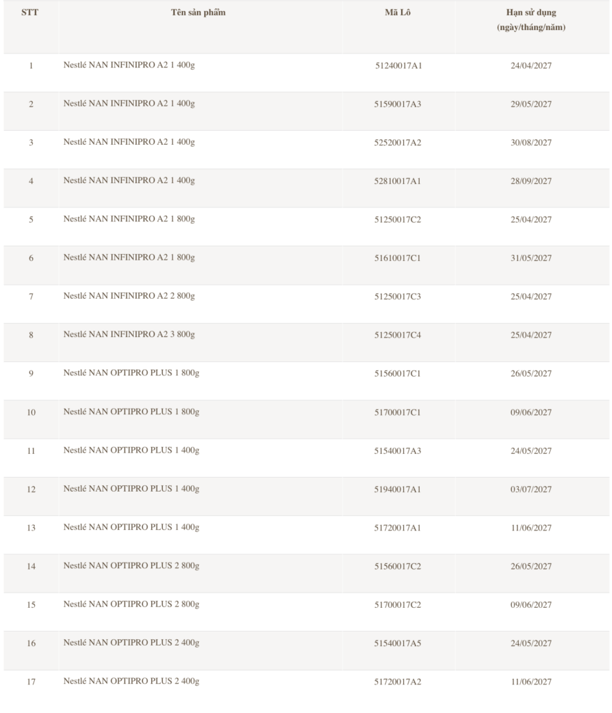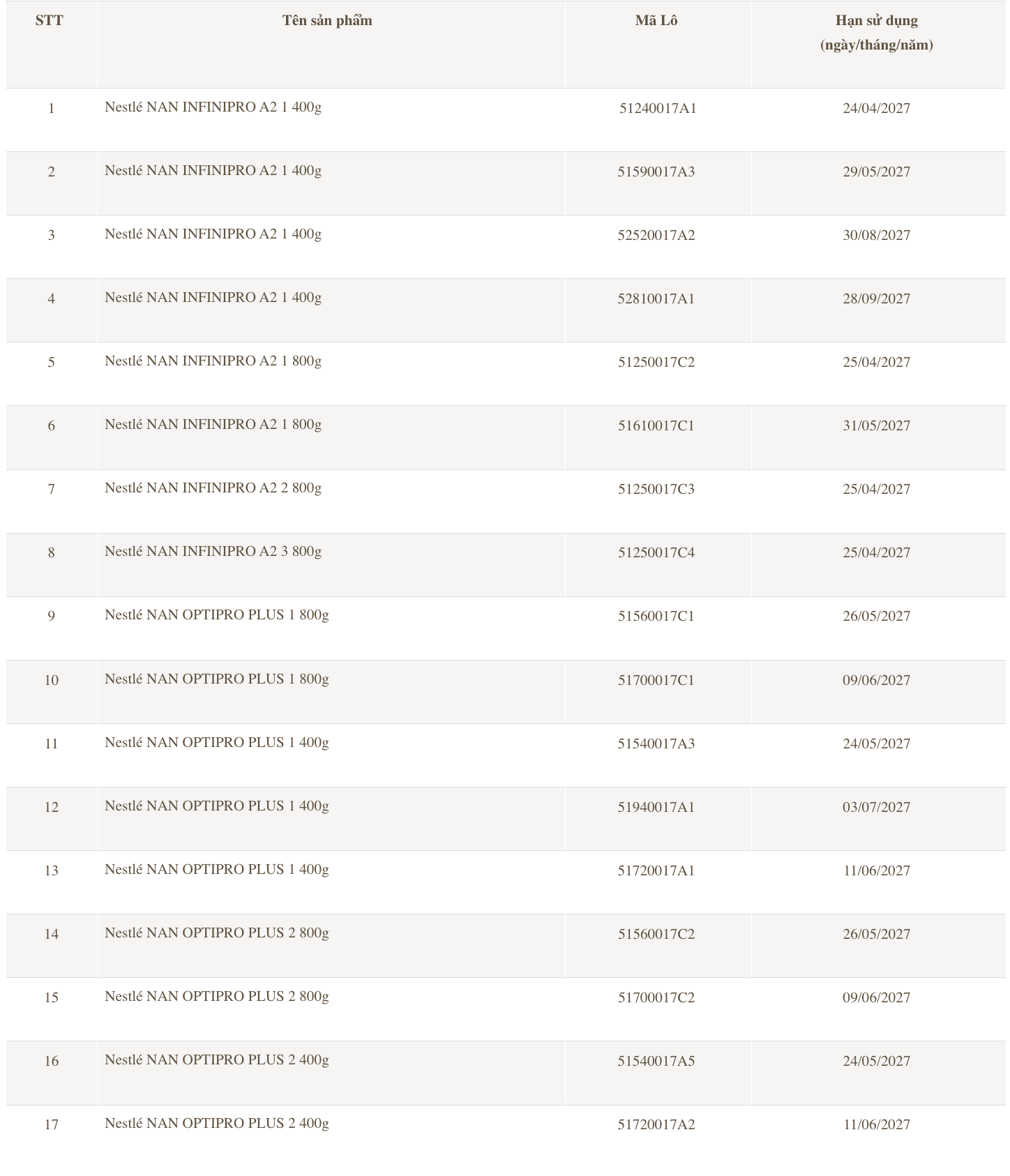 Các lô bị thu hồi có hạn sử dụng kéo dài đến năm 2027. Nestlé khẳng định những sản phẩm không nằm trong danh sách thu hồi vẫn an toàn để sử dụng, đồng thời cho biết các dòng như NAN SupremePro, S-26 Ultima không bị ảnh hưởng. Doanh nghiệp cũng xác nhận không nhập khẩu hay phân phối các sản phẩm BEBA và Alfamino tại Việt Nam.