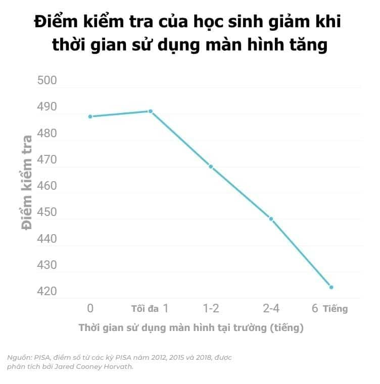 Ông Horvath nhận thấy rằng những học sinh báo cáo dùng máy tính hơn sáu giờ mỗi ngày ở trường có điểm thấp hơn khoảng 65 điểm so với những học sinh không dùng. Ở các quốc gia giàu có, khoảng cách này thậm chí còn lớn hơn, vào khoảng 67 điểm.