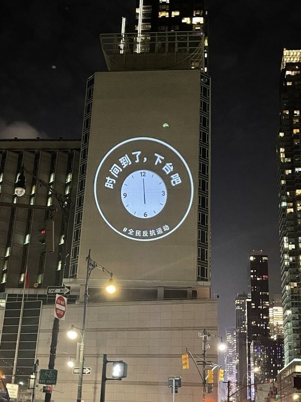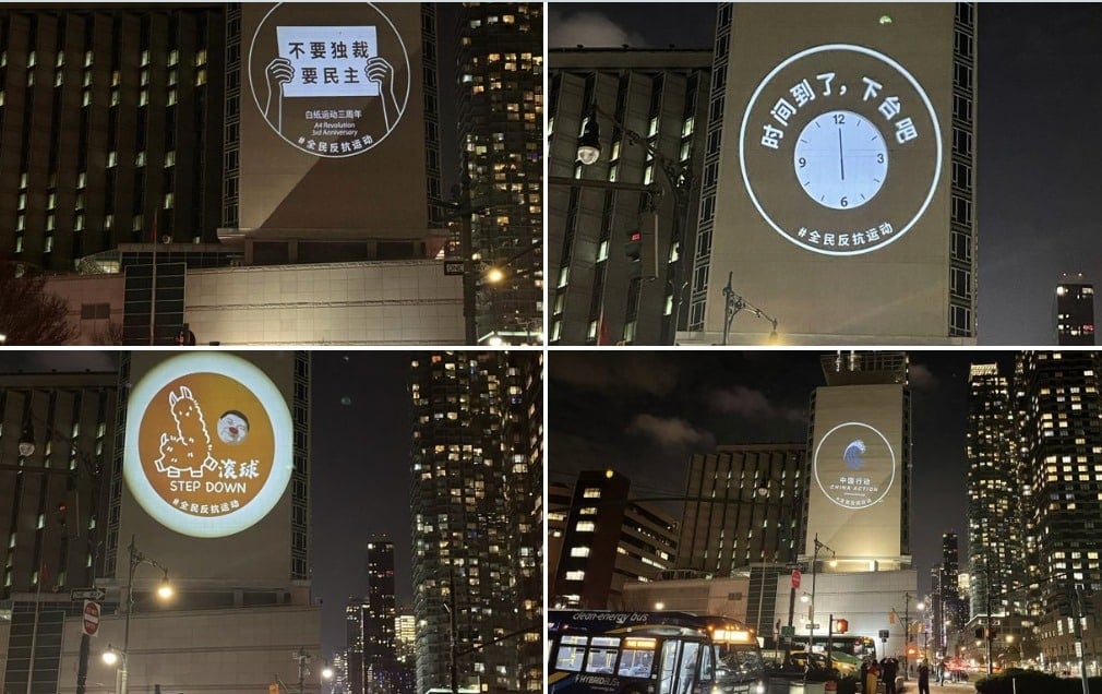 Trung Quốc Đại Lục bước sang năm thứ ba sau “Phong trào Giấy trắng”, tối 26/11, trên bức tường bên ngoài Lãnh sự quán Đảng Cộng sản Trung Quốc (ĐCSTQ) tại New York xuất hiện hình chiếu mang nội dung phản đối ĐCSTQ và phản đối ông Tập Cận Bình. Những hình ảnh này kêu gọi ông Tập từ chức, yêu cầu dân chủ, và được chiếu liên tục trong vài chục phút mà không bị phía lãnh sự quán trực tiếp ngăn chặn.