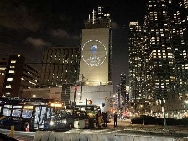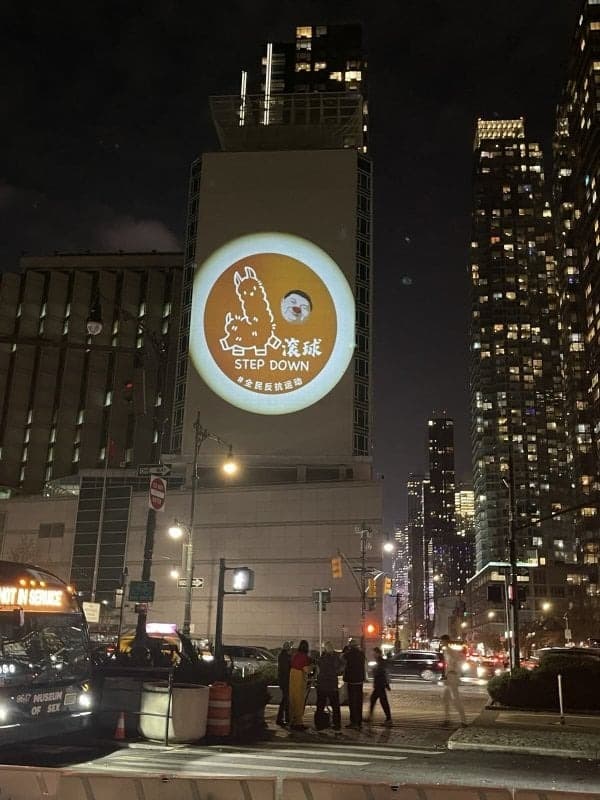 Tối ngày 26/11/2025, trên tường ngoài Lãnh sự quán Trung Quốc tại New York xuất hiện hình chiếu phản đối ông Tập. (Ảnh: China Action)