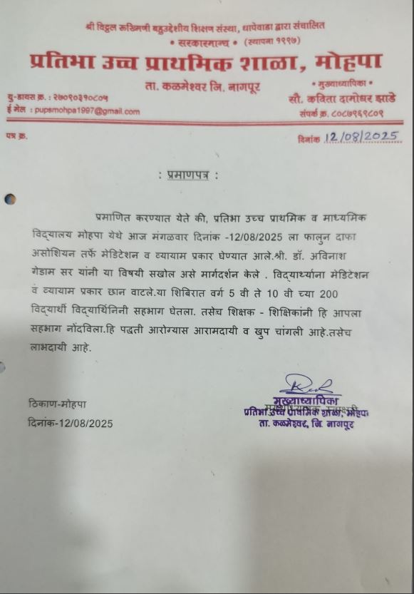 “Giấy chứng nhận, vào thứ Ba, ngày 12/8/2025, Tiến sĩ Avinash Gedam và các học viên Pháp Luân Đại Pháp đã dạy các bài công pháp Pháp Luân Đại Pháp tại Trường Tiểu học và Trung học Phổ thông Pratibha ở Mohepa.