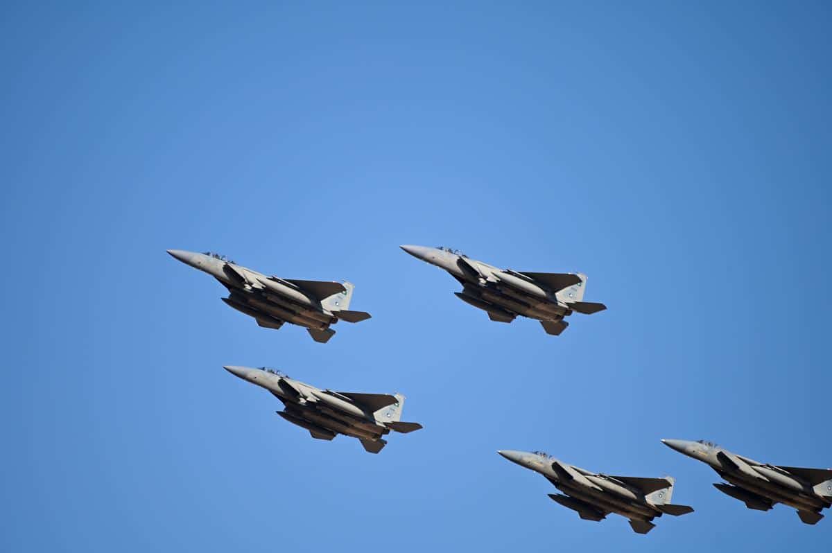 Riyadh, Ả Rập Xê Út – ngày 23/9/2020: Một nhóm phi công chuyên nghiệp của không quân Ả Rập Xê Út trình diễn các màn bay kỹ thuật trên bầu trời thành phố Riyadh, để lại những vệt khói màu xanh lá, trắng và đỏ. (Nguồn: H1N1/Shutterstock)