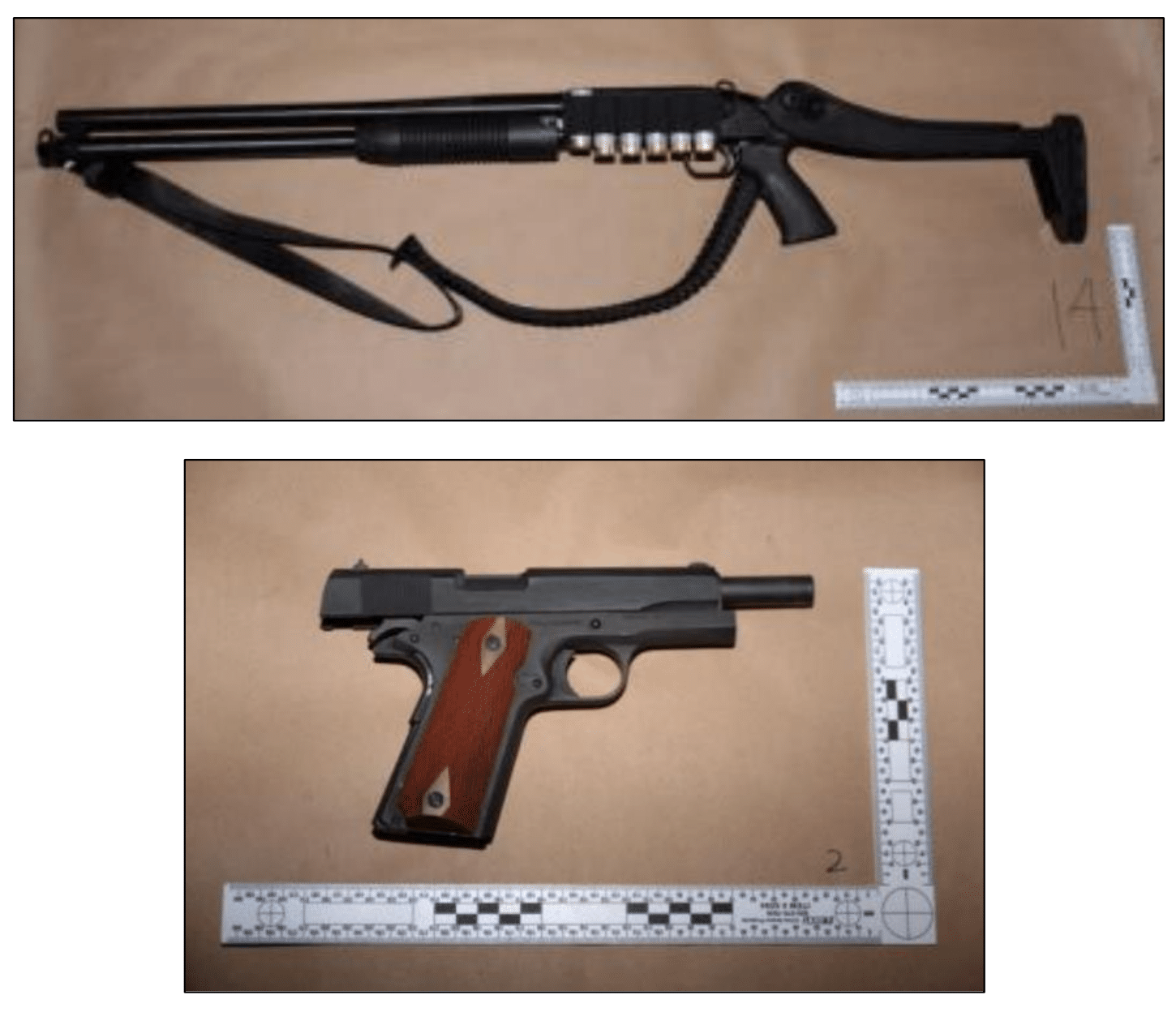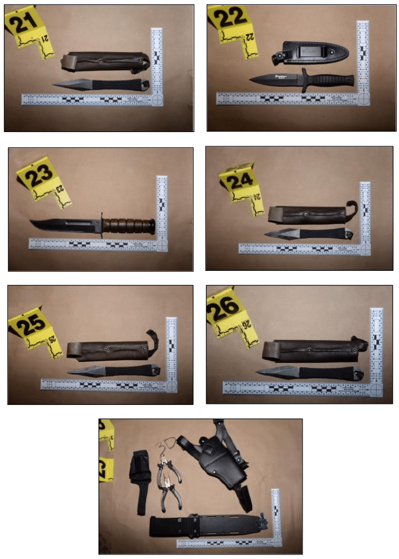 Cáo trạng nêu rõ ảnh phóng to cho thấy nghi phạm mang theo một túi nhỏ chứa đầy đạn (trùng với tang vật thu giữ), một bao súng đeo vai, một con dao có vỏ, cùng các công cụ như kìm và kìm cắt dây – đều tương ứng với vật chứng sau khi bị bắt.