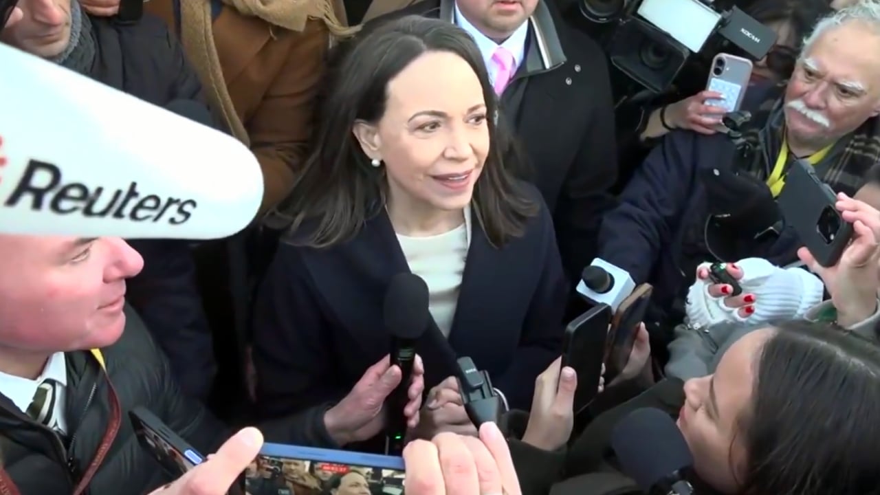 Tổng thống Donald Trump đã tiếp lãnh đạo đối lập Venezuela María Corina Machado trong một buổi ăn trưa tại Nhà Trắng vào ngày 15/1. Trong ảnh bà Machado đang phát biểu với các phóng viên sau cuộc gặp. (Chụp màn hình video)