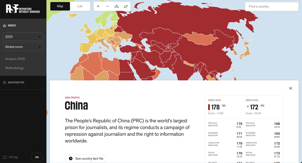 Ngày 9/12, Tổ chức Phóng viên Không Biên giới (RSF) công bố báo cáo năm 2025, chỉ ra rằng Trung Quốc vẫn là nhà tù giam giữ phóng viên lớn nhất thế giới khi giam giữ nhiều phóng viên nhất.