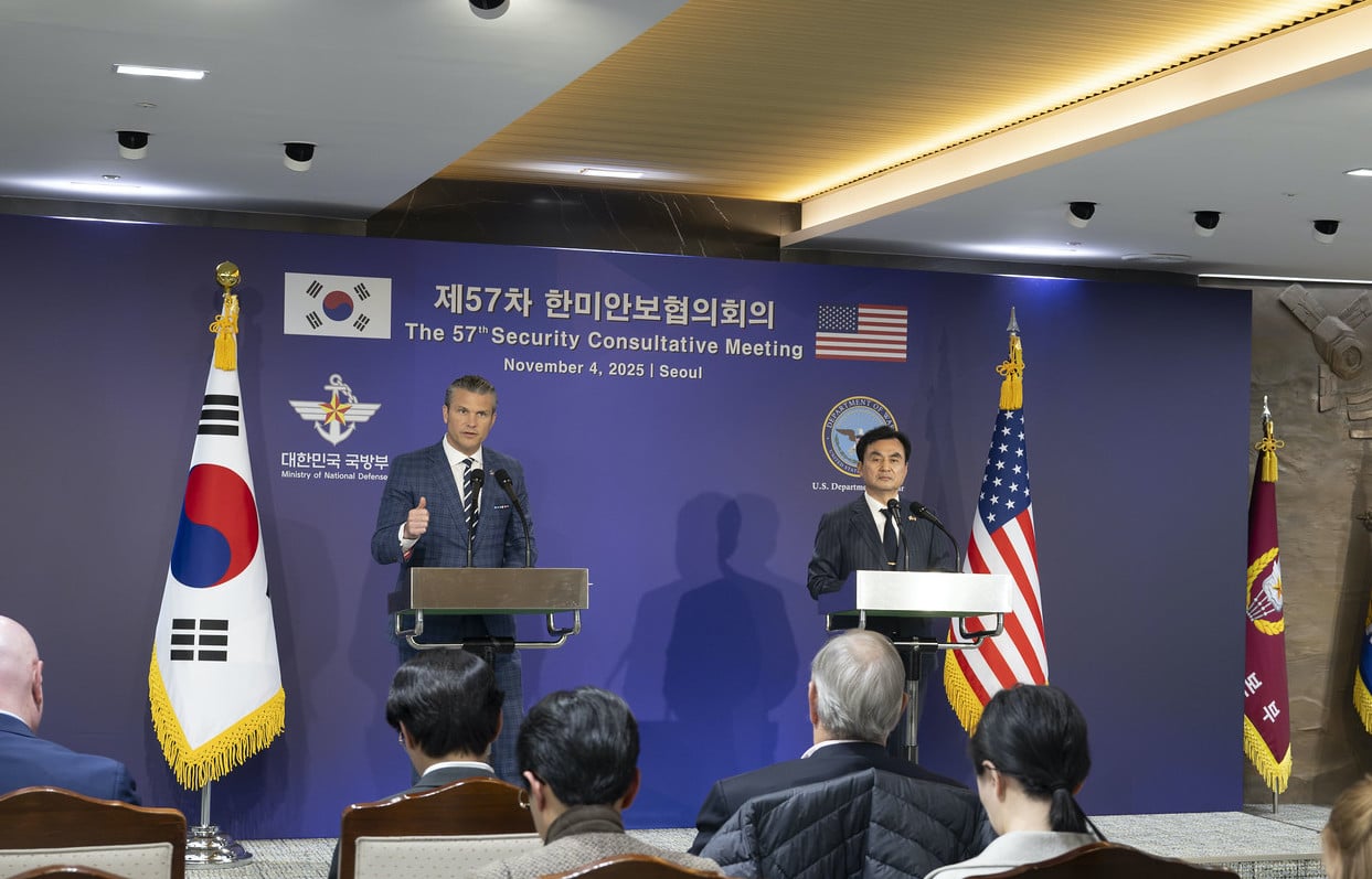 Bộ trưởng Chiến tranh Hoa Kỳ Pete Hegseth và Bộ trưởng Quốc phòng Hàn Quốc Kim Seon-ho tổ chức họp báo chung tại Seoul, Hàn Quốc, ngày 4 tháng 11 năm 2025. (Ảnh: Bộ Chiến tranh, do Hạ sĩ Không quân Hoa Kỳ Madelyn Keech chụp / Flickr)