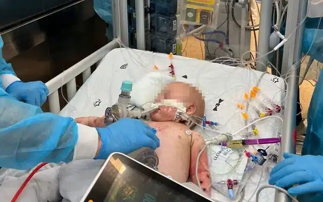 Một em bé sáu tháng tuổi đã được chuyển an toàn từ phòng chăm sóc tích cực tại bệnh viện Schneider đến khu vực được bảo vệ. (Ảnh: Người phát ngôn Trung tâm Y tế Schneider)