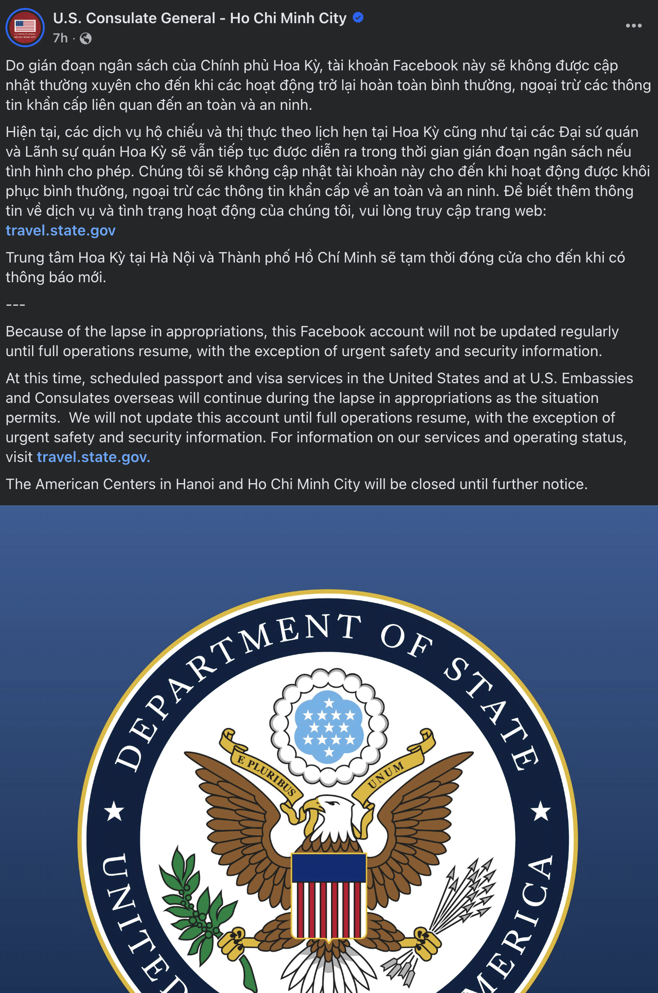 “Do gián đoạn ngân sách của Chính phủ Hoa Kỳ, tài khoản Facebook này sẽ không được cập nhật thường xuyên cho đến khi các hoạt động trở lại hoàn toàn bình thường, ngoại trừ các thông tin khẩn cấp liên quan đến an toàn và an ninh.
