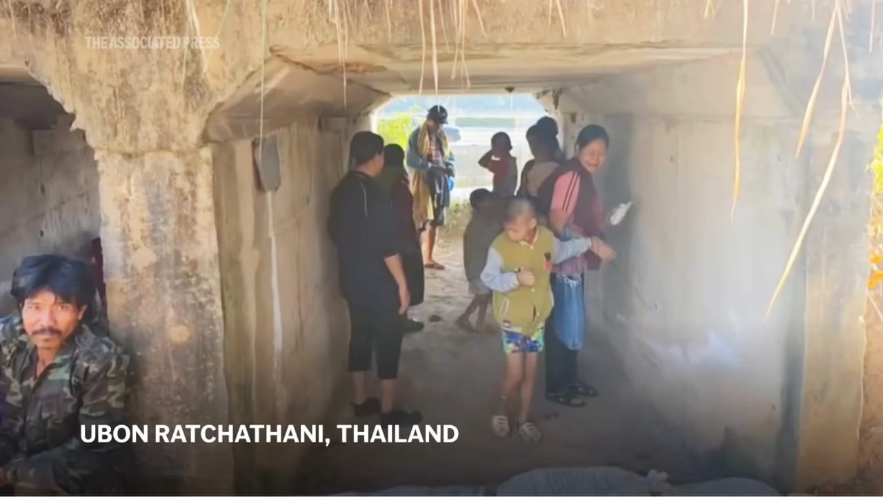 Một khu trú ẩn sơ tán tại một trường đại học ở thành phố Surin, đông bắc Thái Lan, đang tiếp nhận hơn 3.600 người. Người sơ tán ngồi hoặc nằm trên những tấm chiếu mỏng trải trên sàn nhà, và một số đã dựng các lều nhỏ trong khu vực được phân cho họ làm chỗ ngủ.