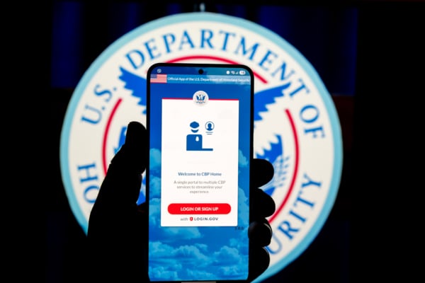 Ứng dụng Home của Cơ quan Hải quan và Bảo vệ Biên giới Hoa Kỳ (CBP) được hiển thị trên điện thoại di động. Ứng dụng này khuyến khích công dân nước ngoài bị mắc kẹt tại Hoa Kỳ tự nguyện rời khỏi đất nước. (Oleksii Pydsosonnii/Epoch Times)