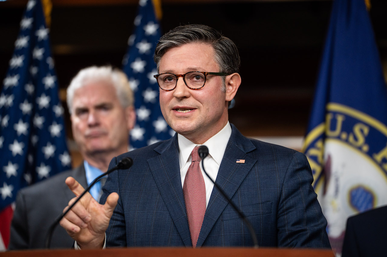 Ngày 22/7/2025, Chủ tịch Hạ viện Hoa Kỳ Mike Johnson phát biểu trong buổi họp báo hàng tuần của Đảng Cộng hòa tại Điện Capitol ở Washington. (Ảnh: Madalina Kilroy/The Epoch Times)