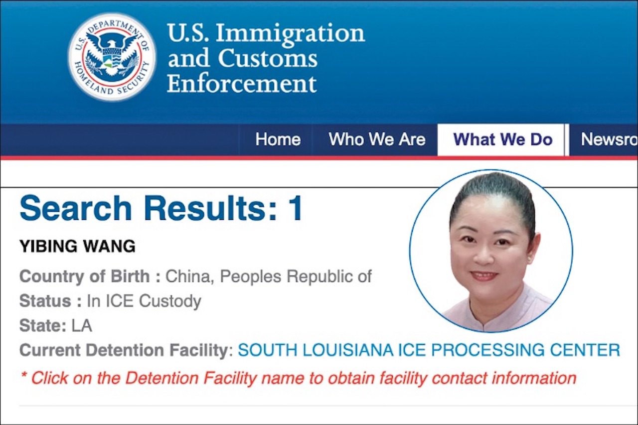 Trang web chính thức của ICE cho thấy địa điểm giam giữ của Vương Nhất Băng (Yibing Wang, hình nhỏ). (Nguồn: Thông tin từ ICE, hình nhỏ do một lãnh đạo cộng đồng người Hoa cung cấp/ Epoch Times tổng hợp)