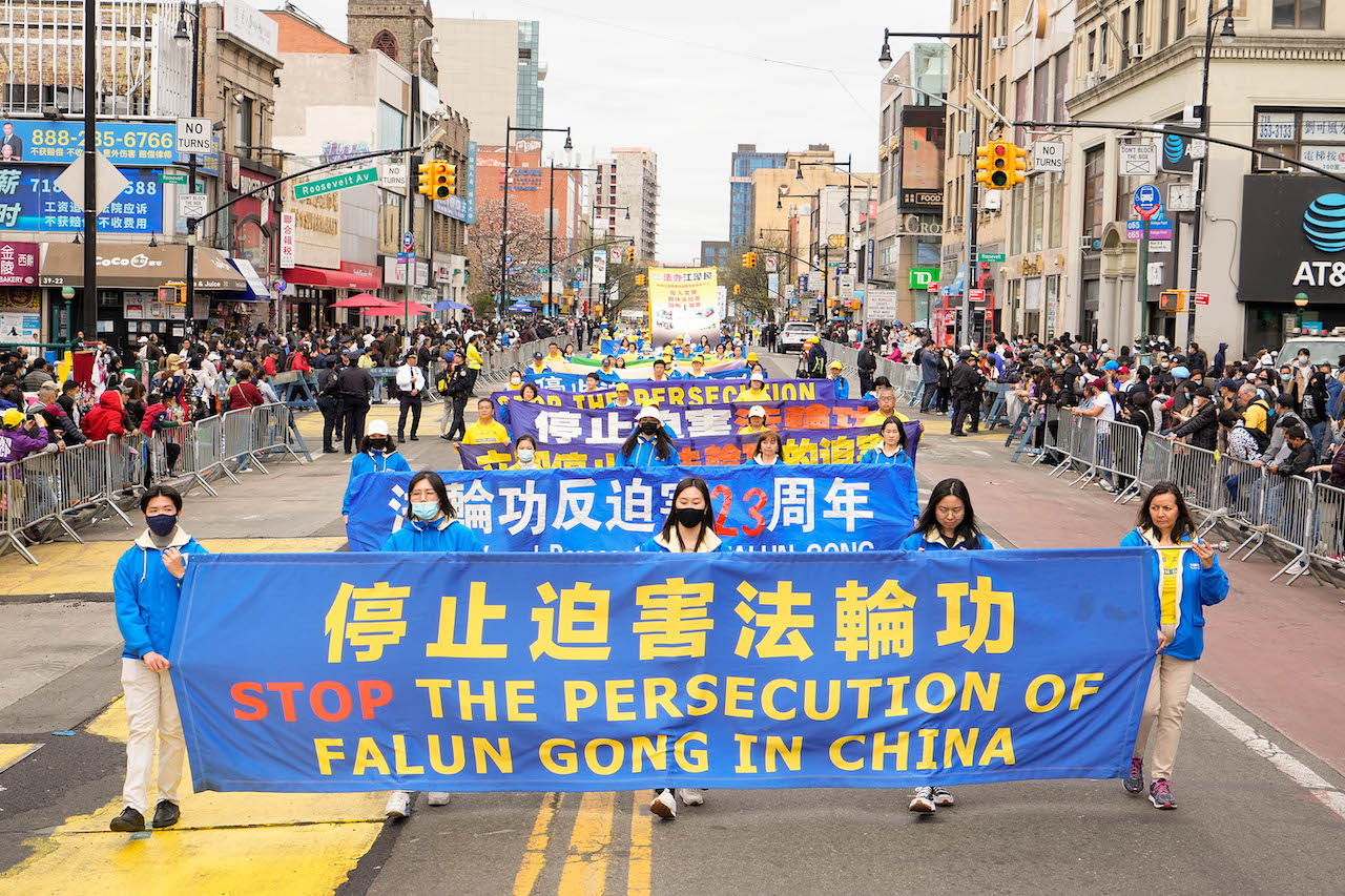 Tháng 4/2022, các học viên Pháp Luân Công giăng biểu ngữ có nội dung "Chấm dứt cuộc bức hại Pháp Luân Công" trong một cuộc tuần hành ở Flushing, New York. (Ảnh: Đới Binh /The Epoch Times)