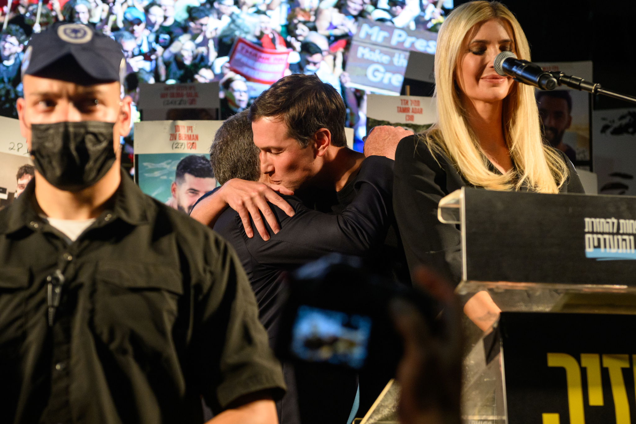 Jared Kushner ôm Đặc phái viên Hoa Kỳ tại Trung Đông Steve Witkoff bên cạnh Ivanka Trump, phát biểu trước đám đông tại Quảng trường Con tin hoặc phát biểu tại cuộc mít tinh hàng tuần "Đưa họ về nhà" tại Quảng trường Con tin vào ngày 11 tháng 10 năm 2025 tại Tel Aviv, Israel. Thỏa thuận ngừng bắn tuần này giữa Israel và Hamas đã chấm dứt hai năm chiến tranh sau các cuộc tấn công ngày 7 tháng 10 năm 2023. Một điều kiện của thỏa thuận là 48 con tin bị giam giữ tại Gaza được trả tự do, trong đó 20 người được cho là vẫn còn sống. (Ảnh: Alexi Rosenfeld/Getty Images)