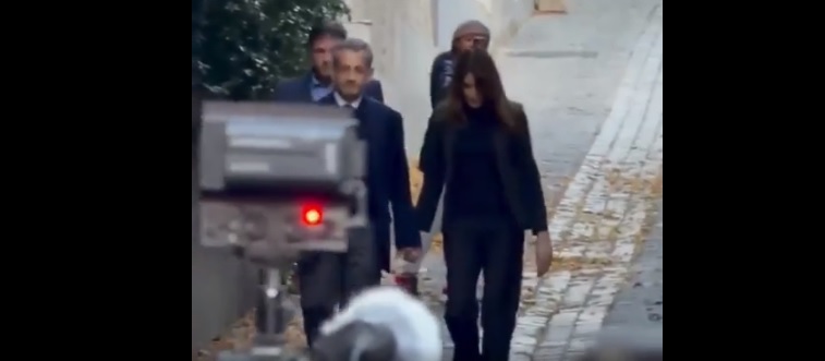 Cựu tổng thống Pháp Sarkozy nắm tay vợ khi rời khỏi nhà riêng để tới nhà giam ở Paris ngày 21/10. (Ảnh: Chụp màn hình)