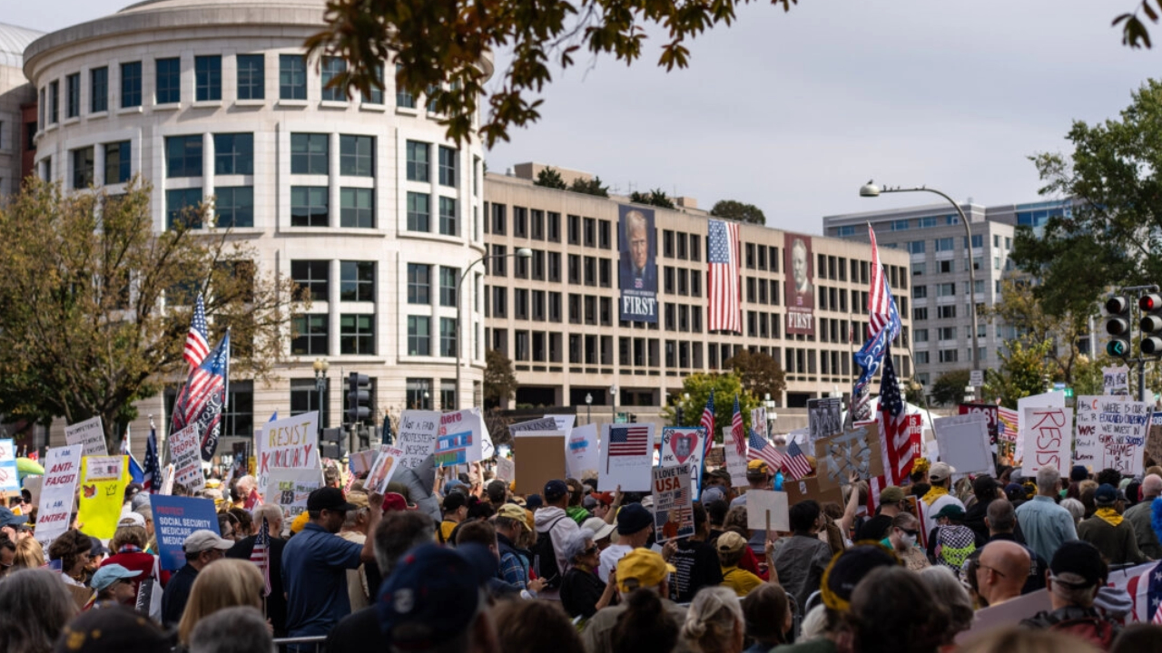 Người dân tham gia cuộc biểu tình "NO KINGS" tại Washington, ngày 18 tháng 10 năm 2025. (Ảnh: Madalina Kilroy/The Epoch Times)