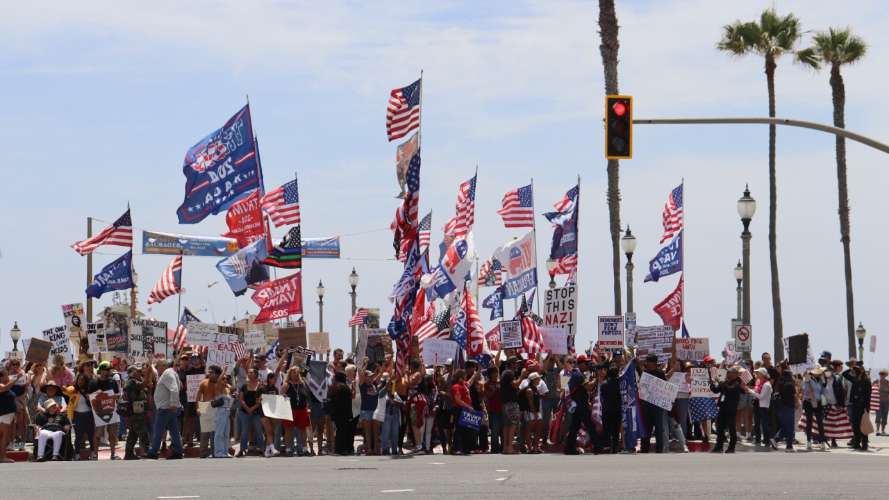 Hầu hết những người cầm cờ và biểu ngữ quốc gia là những người ủng hộ ông Trump, trong khi hầu hết những người cầm biểu ngữ khác là những người biểu tình “No Kings”. (Ảnh: Li Mei/ The Epoch Times)