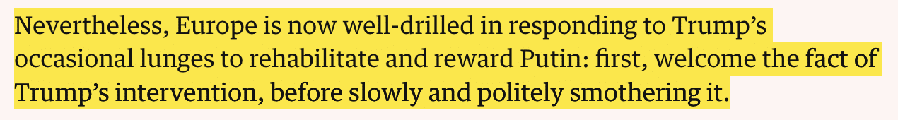 Hôm thứ Bảy, Guardian đưa tin rằng lộ trình hòa bình do Mỹ soạn ban đầu đã khiến “các nhà lãnh đạo châu Âu” rơi vào “một hỗn hợp giữa sự hoài nghi và hoảng loạn,” phơi bày “vực thẳm xuyên Đại Tây Dương” về quan điểm với Nga.