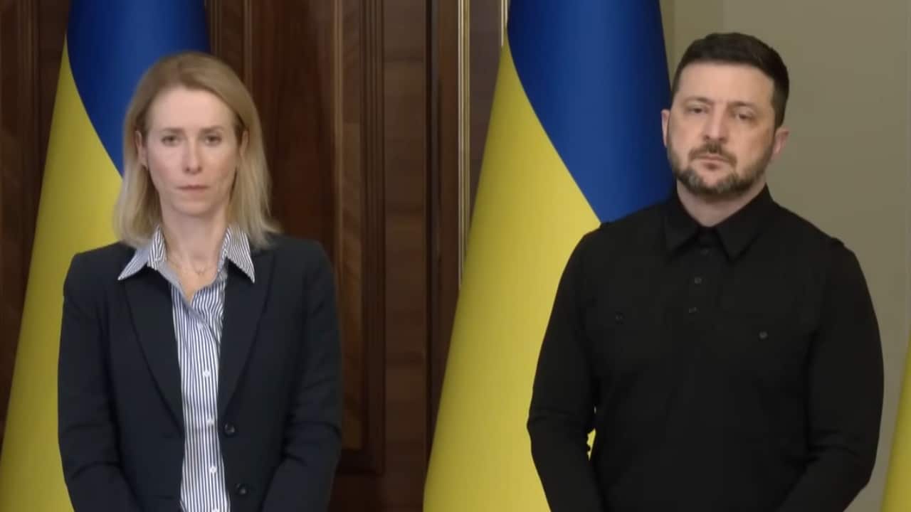 Đại diện chính sách đối ngoại EU - bà Kaja Kallas và Tổng thống Ukraine Zelensky. (Ảnh chụp màn hình video)