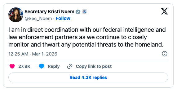 “Tôi đang phối hợp trực tiếp với các đối tác tình báo và cơ quan thực thi pháp luật liên bang của chúng ta, khi chúng tôi tiếp tục theo dõi chặt chẽ và ngăn chặn mọi mối đe dọa tiềm tàng đối với an ninh nội địa,” Bộ trưởng An ninh Nội địa Kristi Noem phát biểu hôm thứ Bảy (28/2/2026).