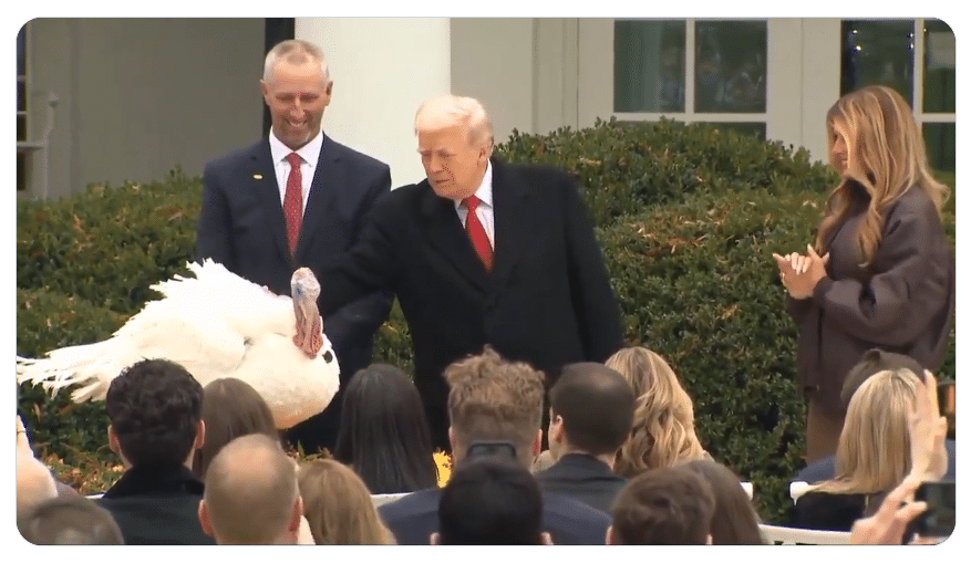 Vào ngày 25/11/2025, Tổng thống Hoa Kỳ Donald Trump đã ân xá cho một chú gà tây tên là 'Gobble' tại Vườn Hồng của Nhà Trắng. (Ảnh chụp màn hình video)