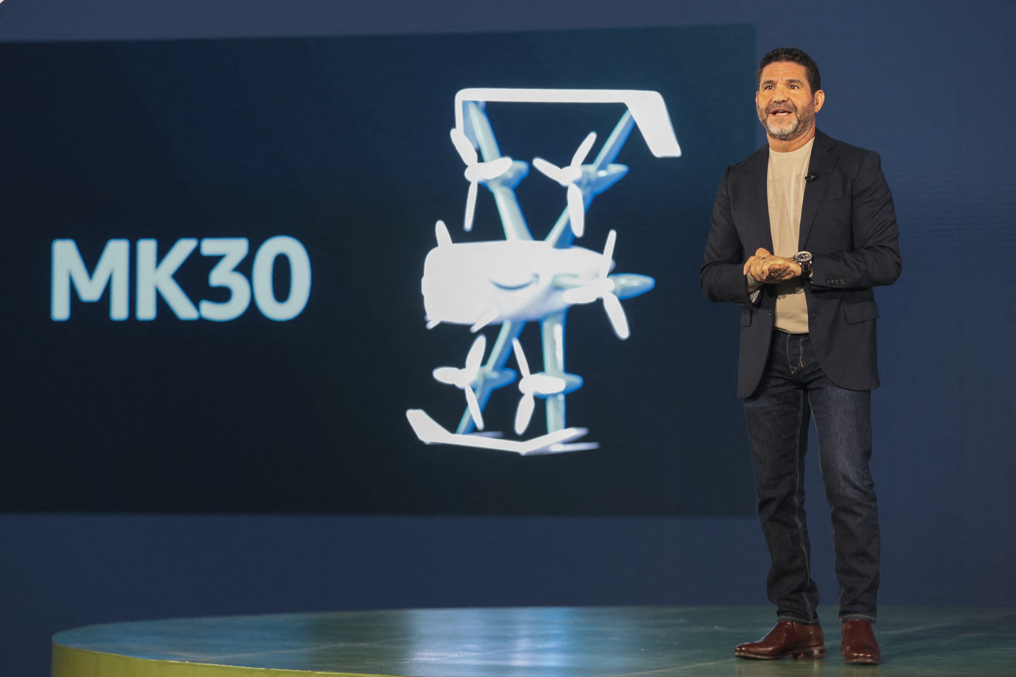 David Carbon, Phó chủ tịch Prime Air, giới thiệu máy bay không người lái giao hàng MK30 Prime Air tại sự kiện "Tương lai của giao hàng" của Amazon tại trung tâm hoàn thiện đơn hàng BFI1 và trung tâm nghiên cứu robot ở Sumner, Washington, vào ngày 18/10/2023. (Jason Redmond/AFP qua Getty Images)