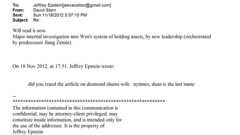 Hồ sơ Epstein do Bộ Tư pháp Mỹ công bố liên quan đến nhiều quan chức cấp cao của Đảng Cộng sản Trung Quốc (ĐCSTQ). Trong một lần trao đổi qua email, thân tín David Stern của Epstein có đề cập đến việc chính quyền Tập Cận Bình tiến hành điều tra tài sản ở nước ngoài của cựu Thủ tướng Ôn Gia Bảo, và cho biết đây là một chiến lược do ông Giang Trạch Dân thực hiện.