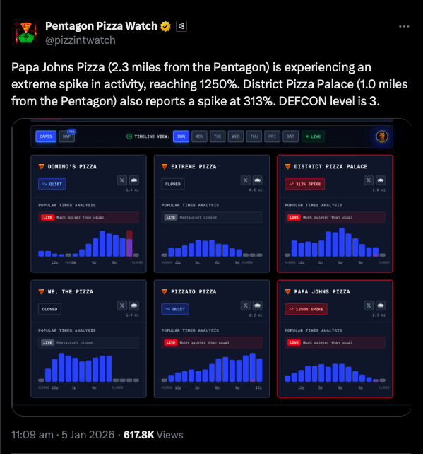 Ngay sau khi Mỹ tiến hành tấn công Venezuela, một tiệm bánh pizza gần Lầu Năm Góc ở Arlington, Virginia (được nhắc tên là Pizzato Pizza) ghi nhận lượng “hoạt động” tăng đột biến vào khoảng 2:00 sáng (ET) — thời điểm được cho là xấp xỉ 1 giờ sau khi các đợt không kích bắt đầu.