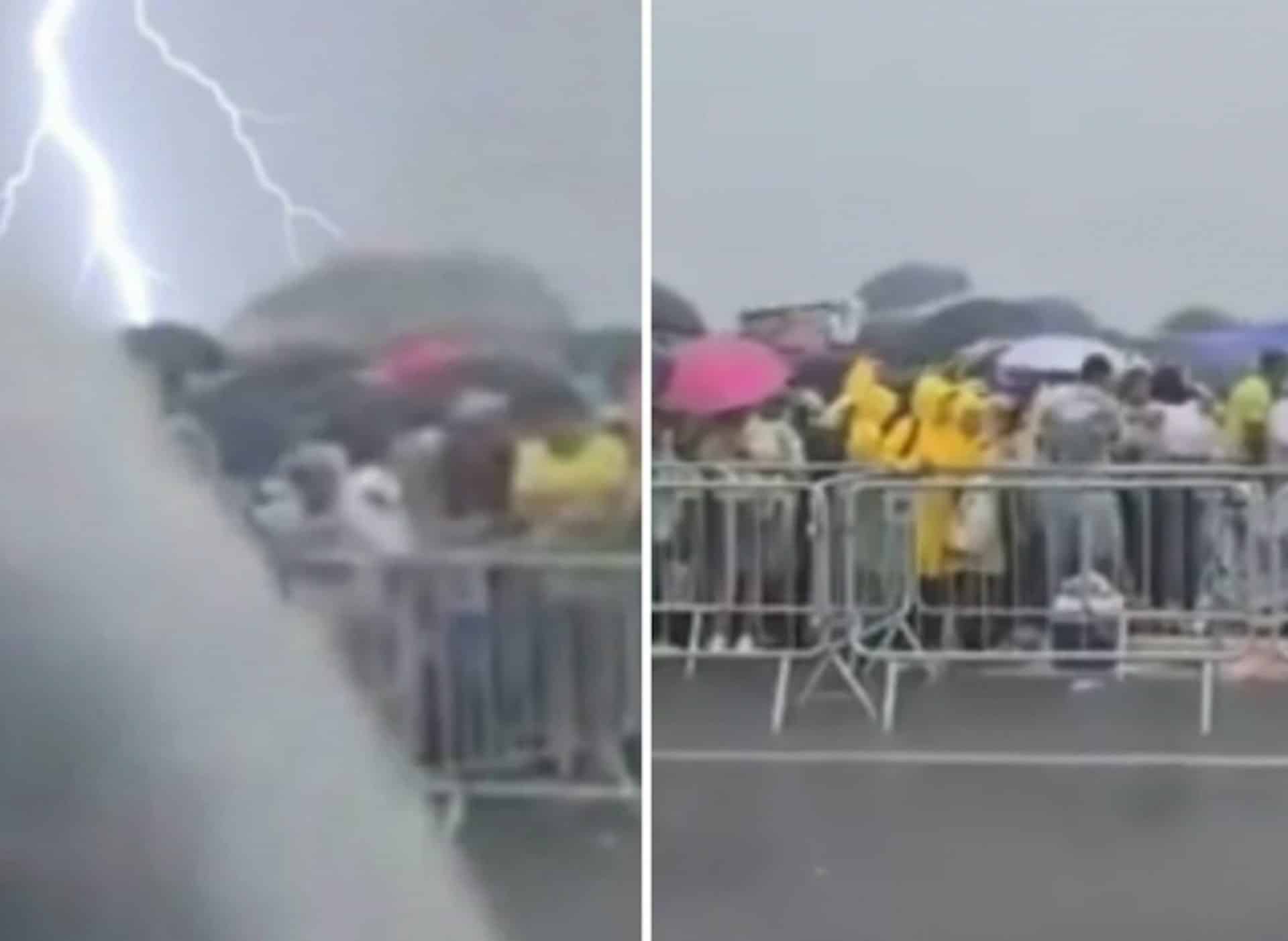 Các đoạn video lan truyền trên mạng cho thấy, giữa đám đông người đội đủ loại ô màu sắc, khoác áo mưa nilon, một người đàn ông mặc đồ đen đang bước đi phía trước bất ngờ bị tia chớp lóe sáng kèm tiếng nổ vang dội làm choáng váng, đứng sững tại chỗ bất động. Khi ống kính quay sang phía đối diện, có người bỗng ngã gục, những người xung quanh lập tức đỡ nạn nhân dậy.