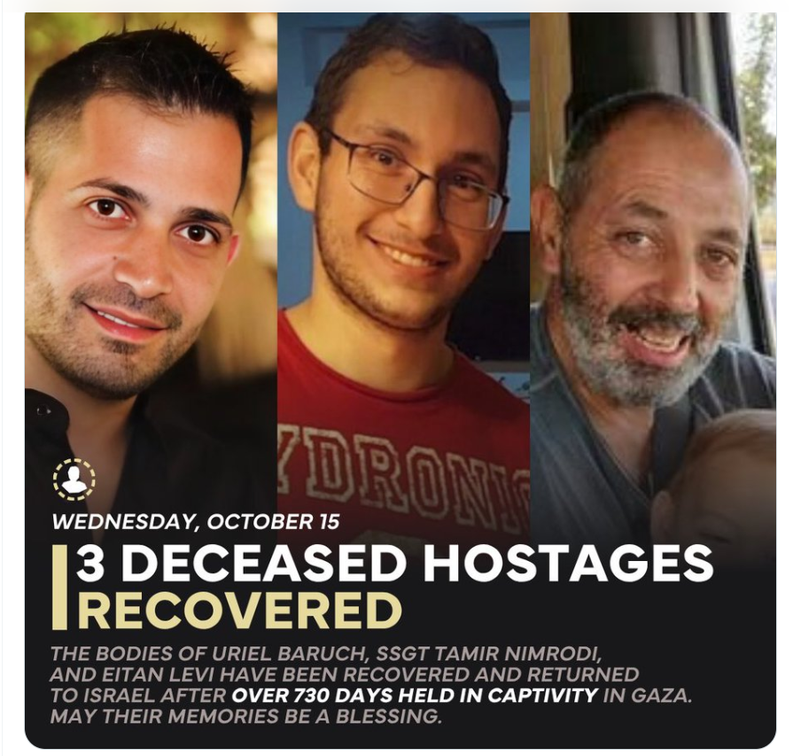 “Trung sĩ Tamir Nimrodi bị bắt cóc khi còn sống và bị giết khi đang bị giam cầm ở tuổi 18. Uriel Baruch bị giết trong vụ thảm sát ngày 7/10 và thi thể của anh bị đưa đến Gaza. Eitan Levi bị giết trong vụ thảm sát ngày 7/10 và thi thể của anh bị đưa đến Gaza. Cầu mong những kỷ niệm về họ sẽ là một phước lành”, một bài đăng khác của IDF trên X cho biết.