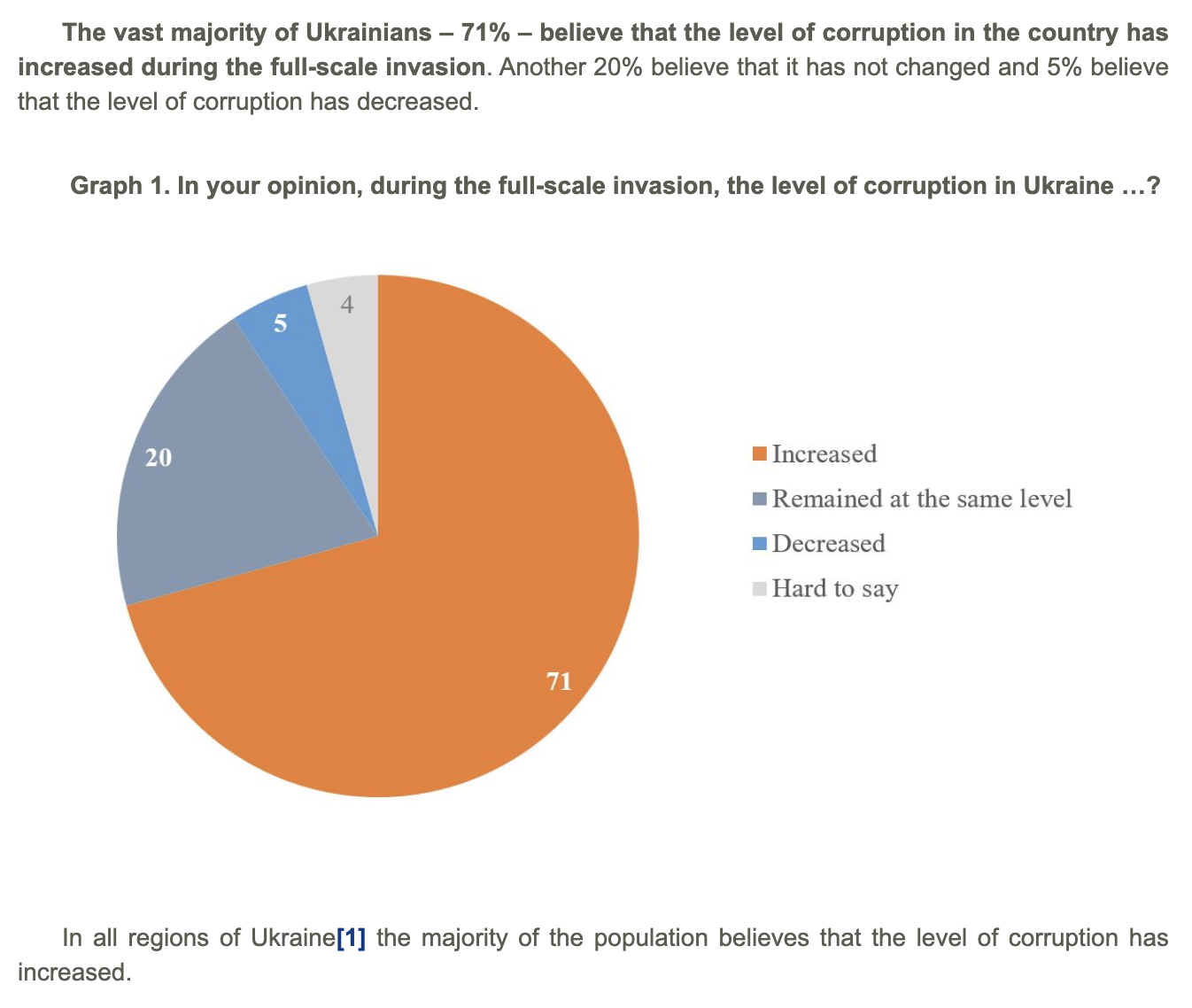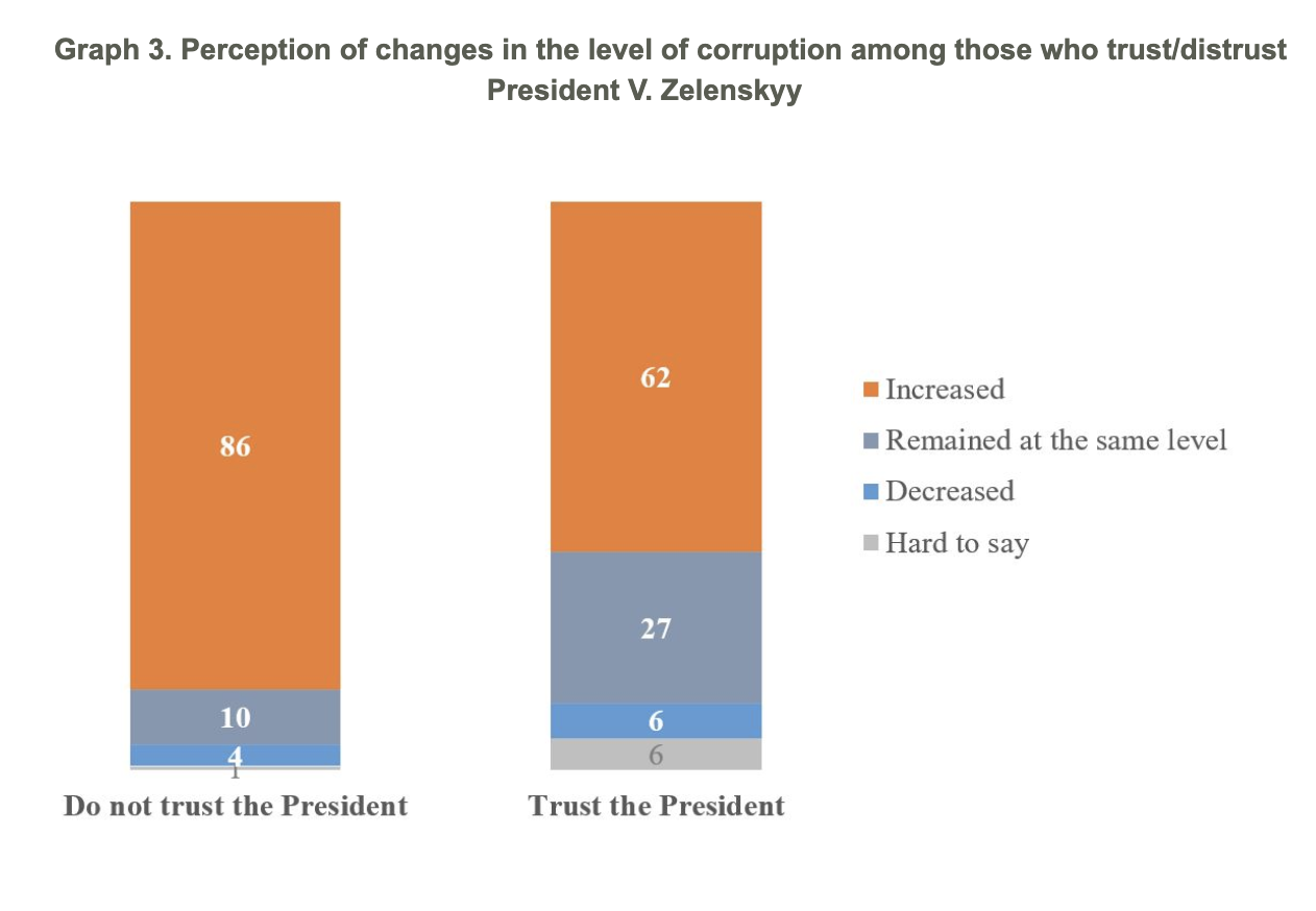 Theo khảo sát, ngay cả trong số những người tin tưởng vào Tổng thống Vladimir Zelensky, 62% vẫn cho rằng tham nhũng đã gia tăng kể từ khi xung đột leo thang.
