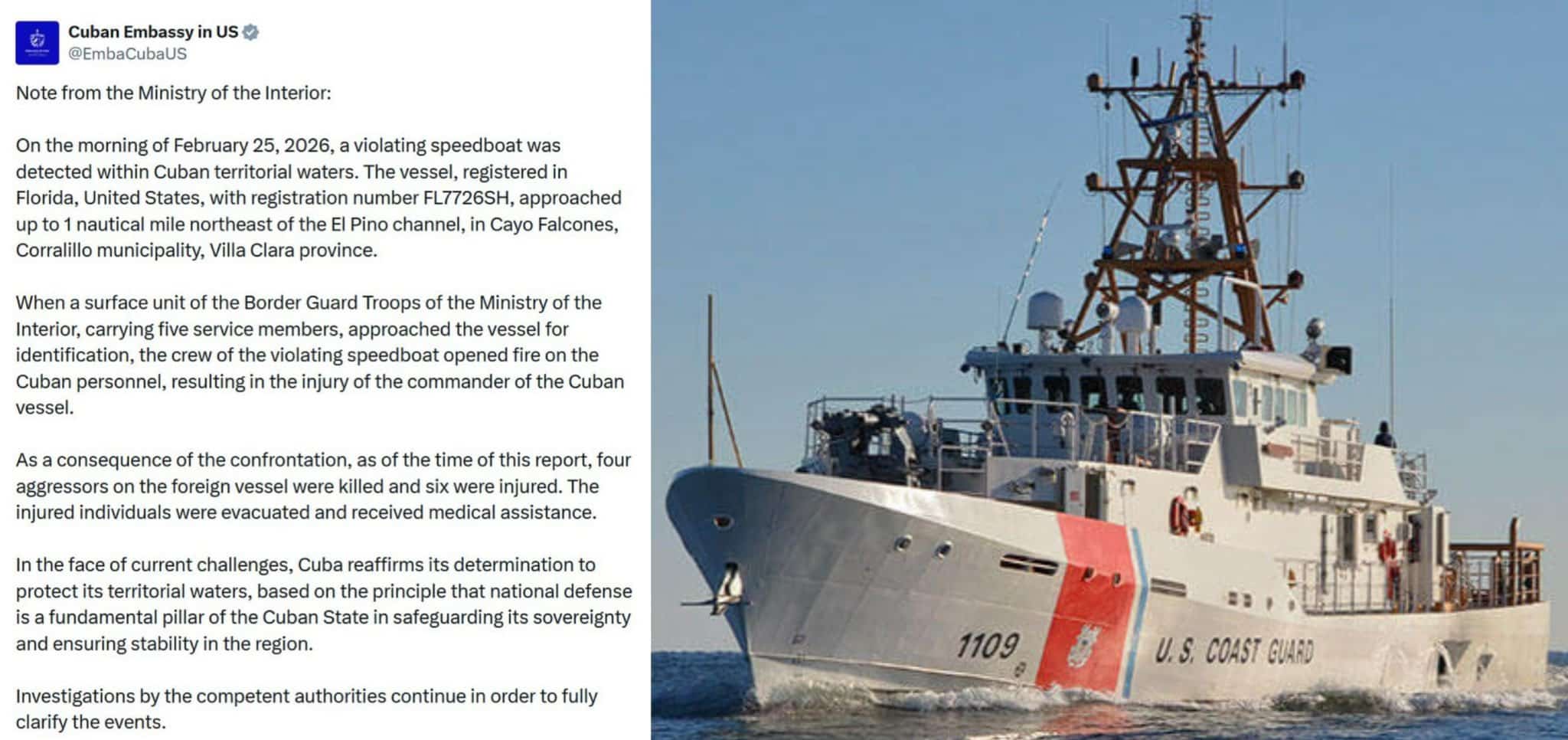 Bộ Nội vụ Cuba ra thông cáo nhưng không cung cấp nhiều chi tiết về vụ nổ súng. Thông cáo cho biết con tàu ở vị trí cách khoảng 1 dặm về phía đông bắc Cayo Falcones, ngoài khơi bờ biển phía bắc Cuba.