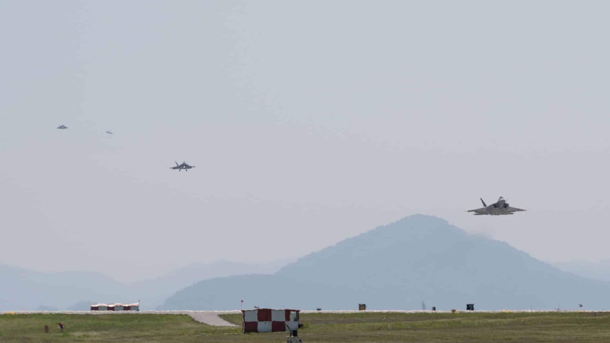 Ngày 13/5/2024, bốn máy bay chiến đấu F-22 của Không quân Hoa Kỳ chuẩn bị hạ cánh xuống Căn cứ Không quân Gunsan ở Hàn Quốc. (Ảnh: Nicholas Ross/Không quân Hoa Kỳ)