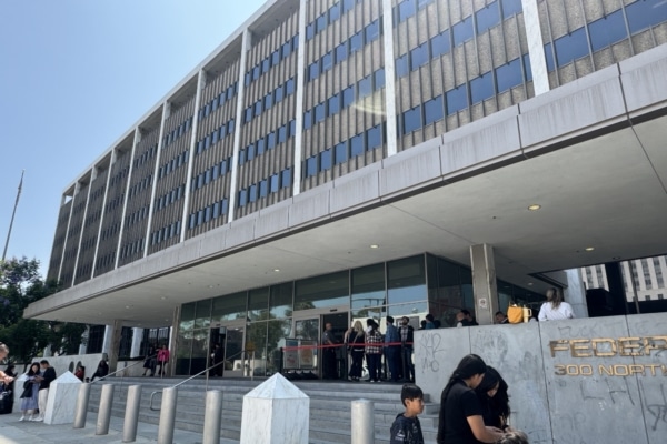 Bức ảnh cho thấy mọi người xếp hàng bên ngoài tòa nhà Sở Di trú và Nhập tịch Hoa Kỳ (USCIS) tại Los Angeles vào ngày 25/6/2025. (Hàn Băng/Epoch Times)